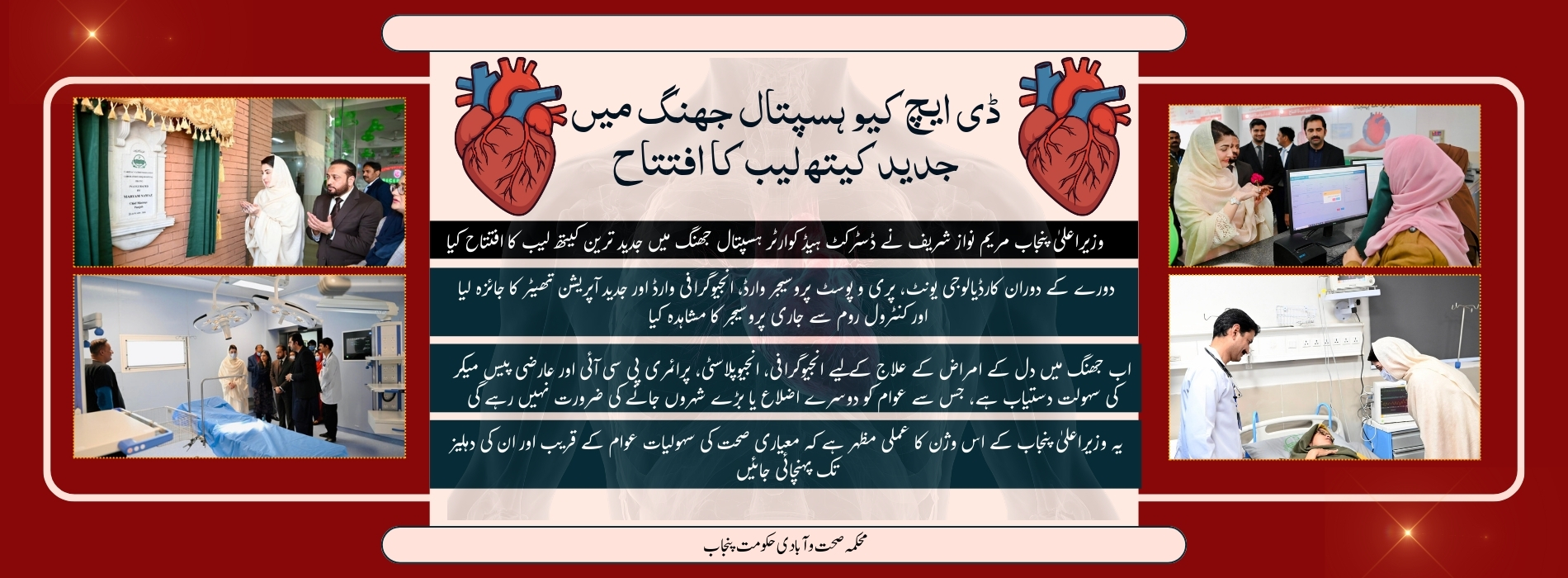 Chief Minister Maryam Punjab Nawaz Sharif inaugurated a state-of-the-art Cath Lab at District Headquarters (DHQ) Hospital, Jhang, to strengthen cardiac healthcare services in remote and underserved areas of the province. Addressing the inauguration ceremony, the Chief Minister also announced the launch of cardiac surgery services at the hospital, ensuring timely and life-saving treatment for heart patients at the local level.