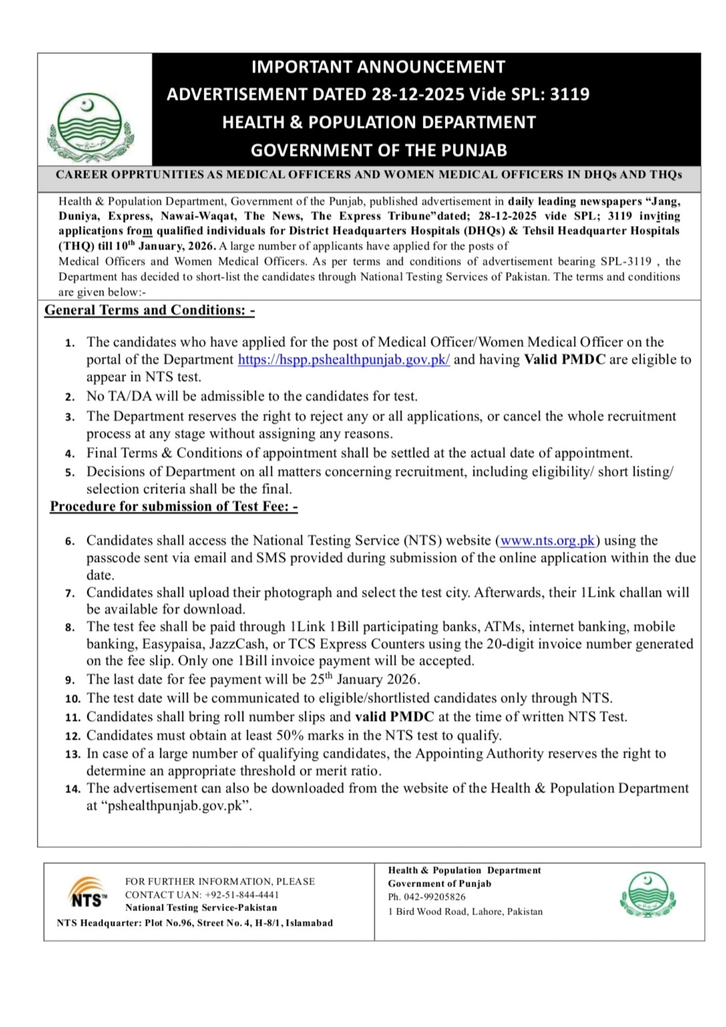 Important Announcement | Health & Population Department, Punjab Shortlisting for Medical Officers and Women Medical Officers will be conducted through NTS. Last date to submit test fee is 25th January 2026. Eligible candidates are advised to review the advertisement for complete details.