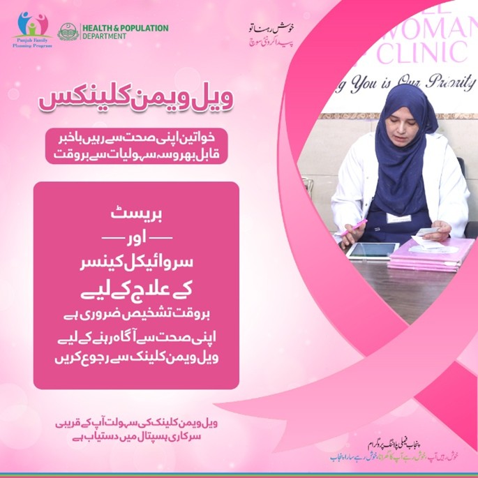 اپنی صحت کے بارے میں آگاہی کے لیے ویل ویمن کلینک سے رجوع کریں۔ ویل ویمن کلینک کی سہولت آپ کے قریبی سرکاری ہسپتال میں دستیاب ہے۔