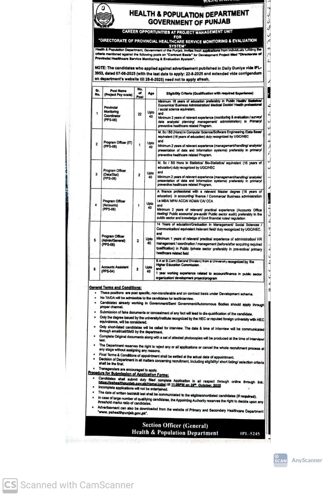 Corrigendum dated 07.08.2022 vide IPL number 8054- Vacant Post of Lady Health Visitors (LHVs) Under Punjab Human Capital Investment Project (PHCIP) Directorate of IRMNCH & NP, 5-Montgomery Road Lahore